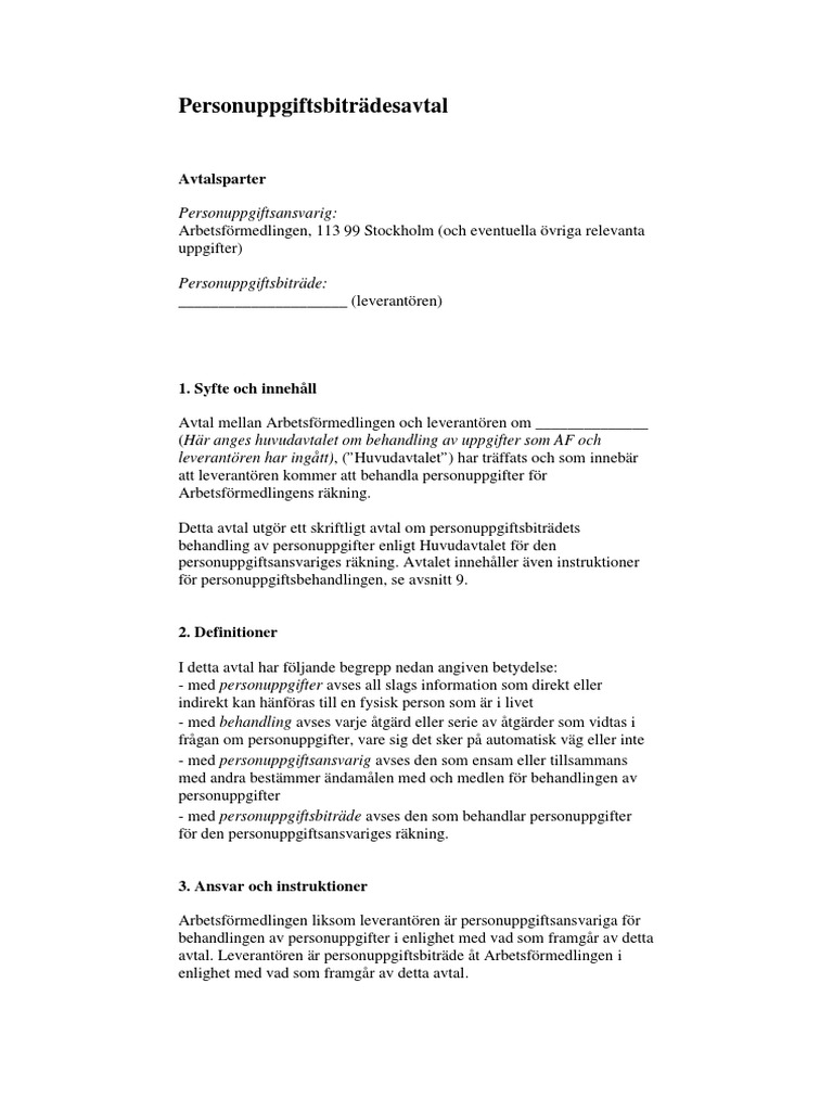 Personuppgiftsbitradesavtal Mall Enligt Gdpr