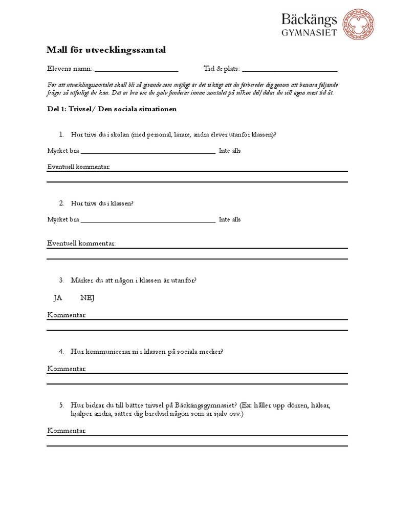 Mall For Utvecklingssamtal Del 1 Trivsel Den Sociala Situationen